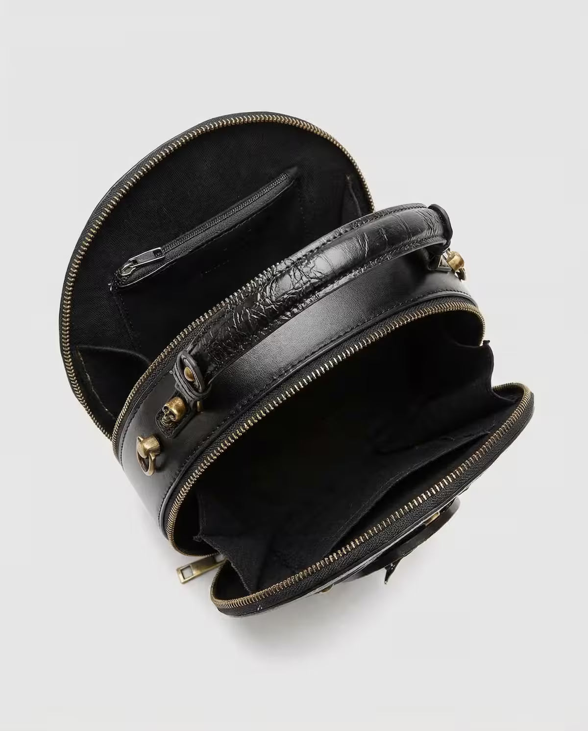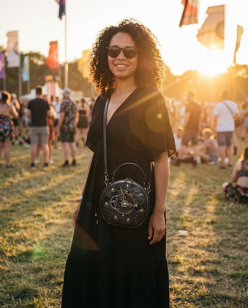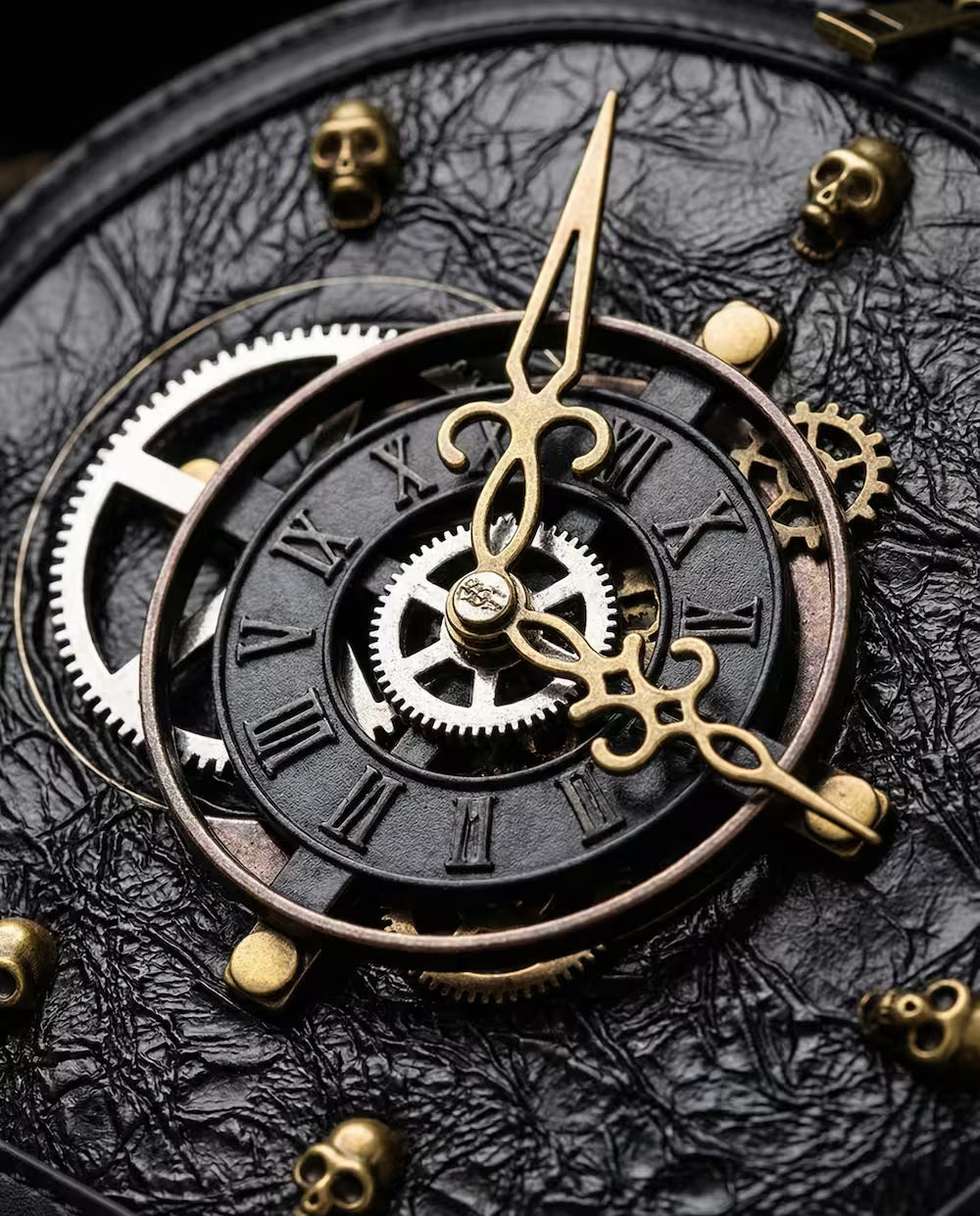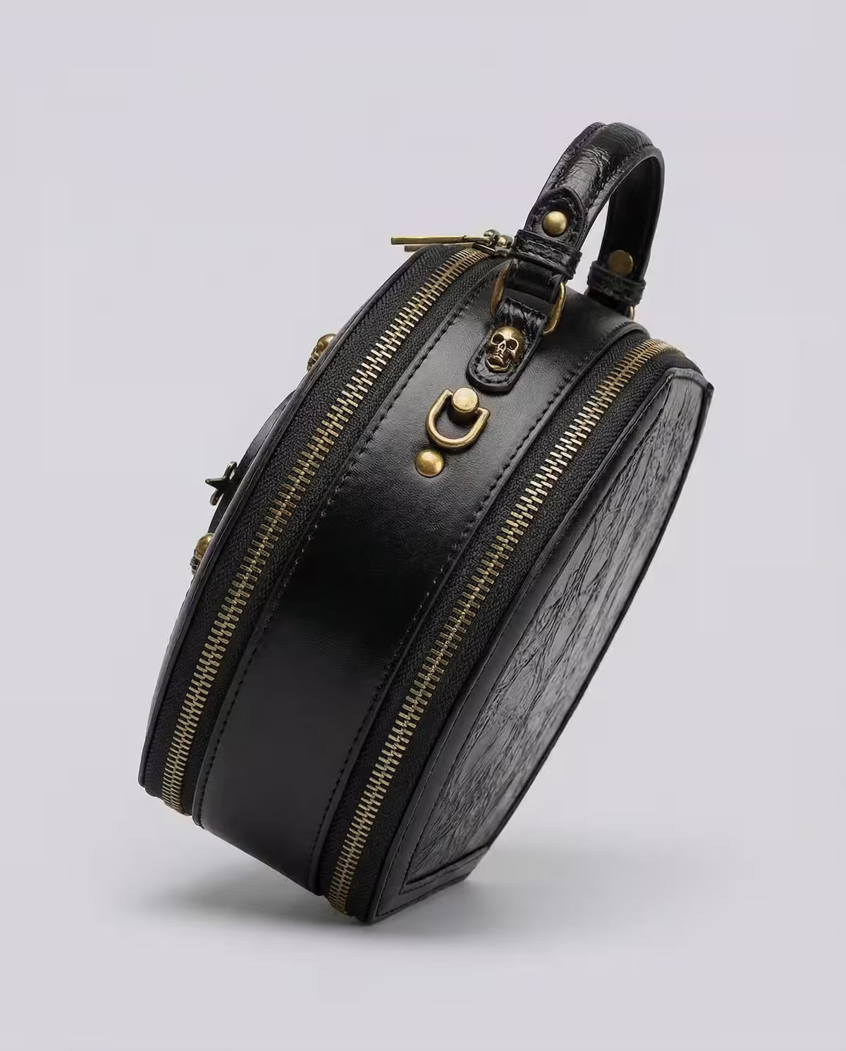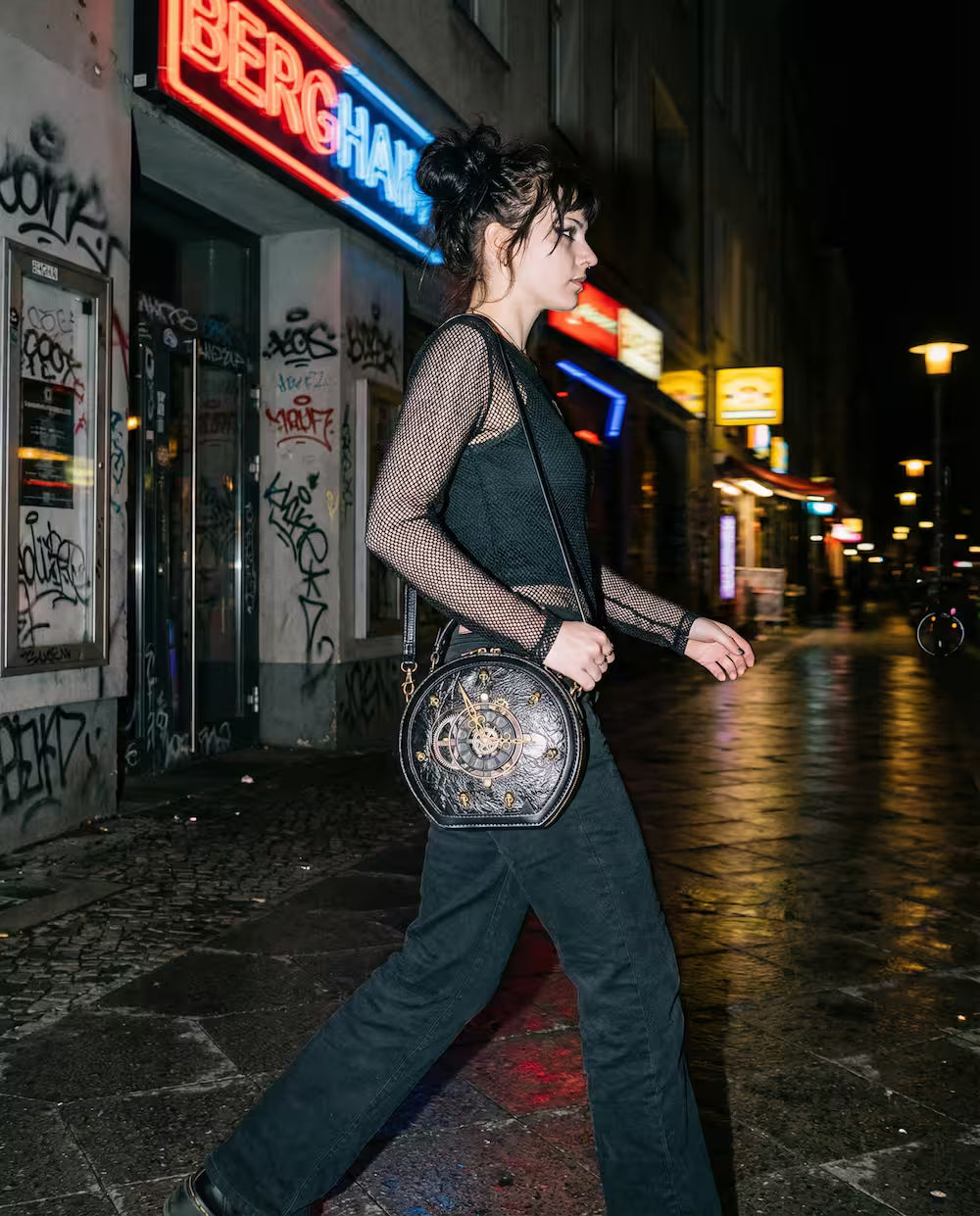 Time waits for no one. The Reverie is a fusion of steampunk mechanics and gothic darkness. This round bag features a 3D clock face with exposed gears, Roman numerals, and ornate hands. A functional accessory that doubles as a piece of wearable art.